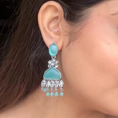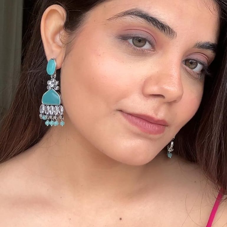 Blue Enamelled Oxidized Bell pearl drop jhumka