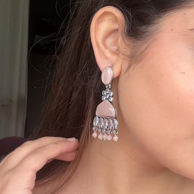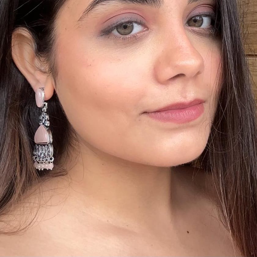 Beige Enamelled Oxidized Bell pearl drop jhumka