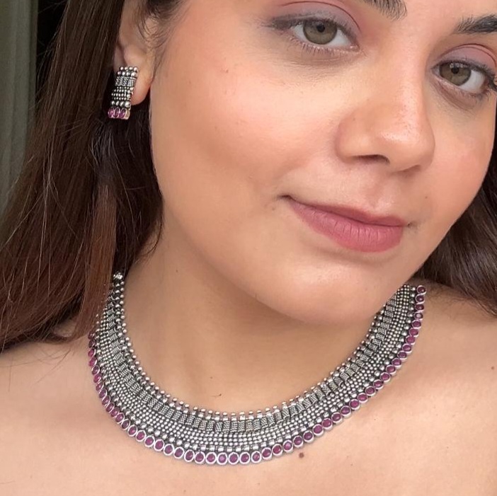 Be the first to review “Oxidised Tear Drop Pink Necklace with Earrings”