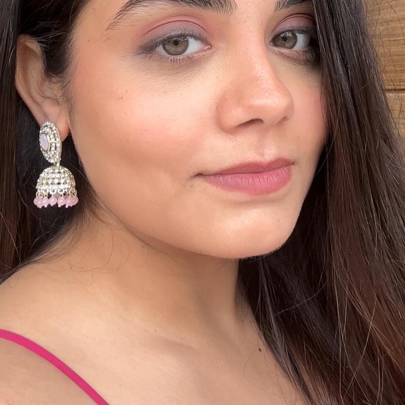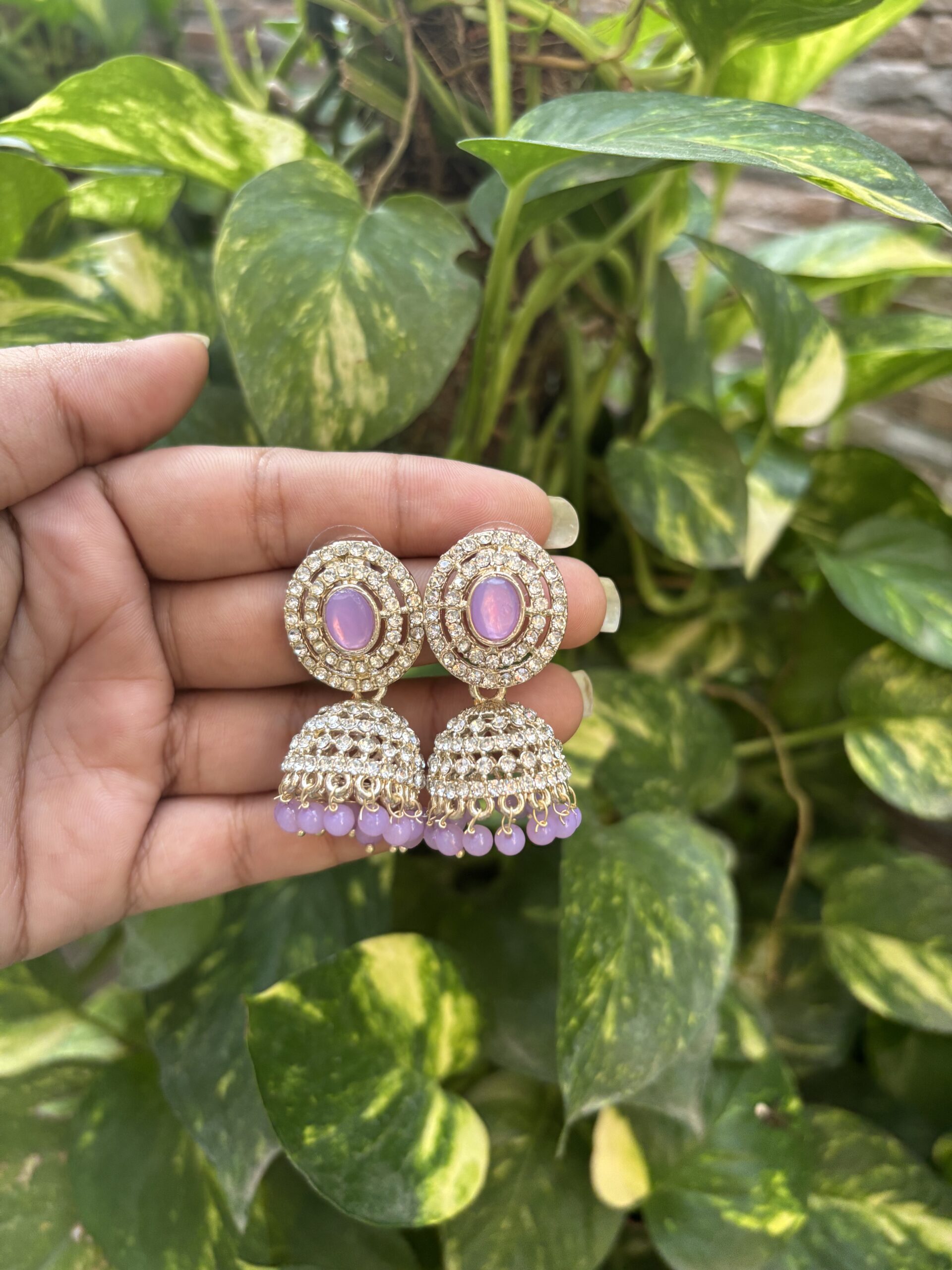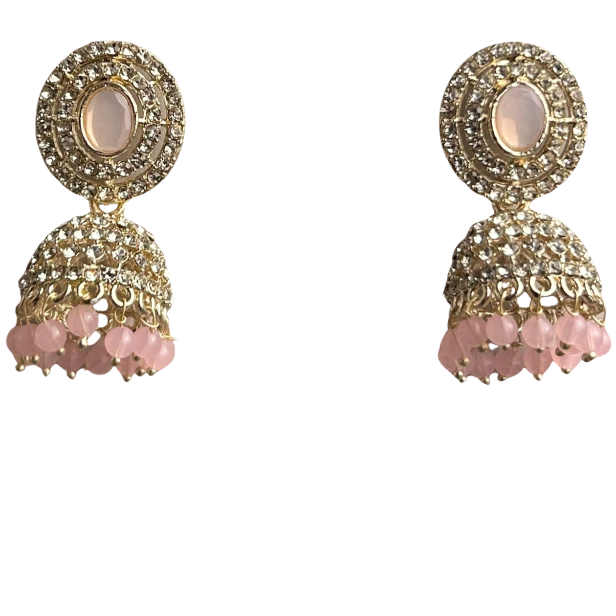 Pink Stone Round Jhumka Earrings Dome Shaped Pushback Design